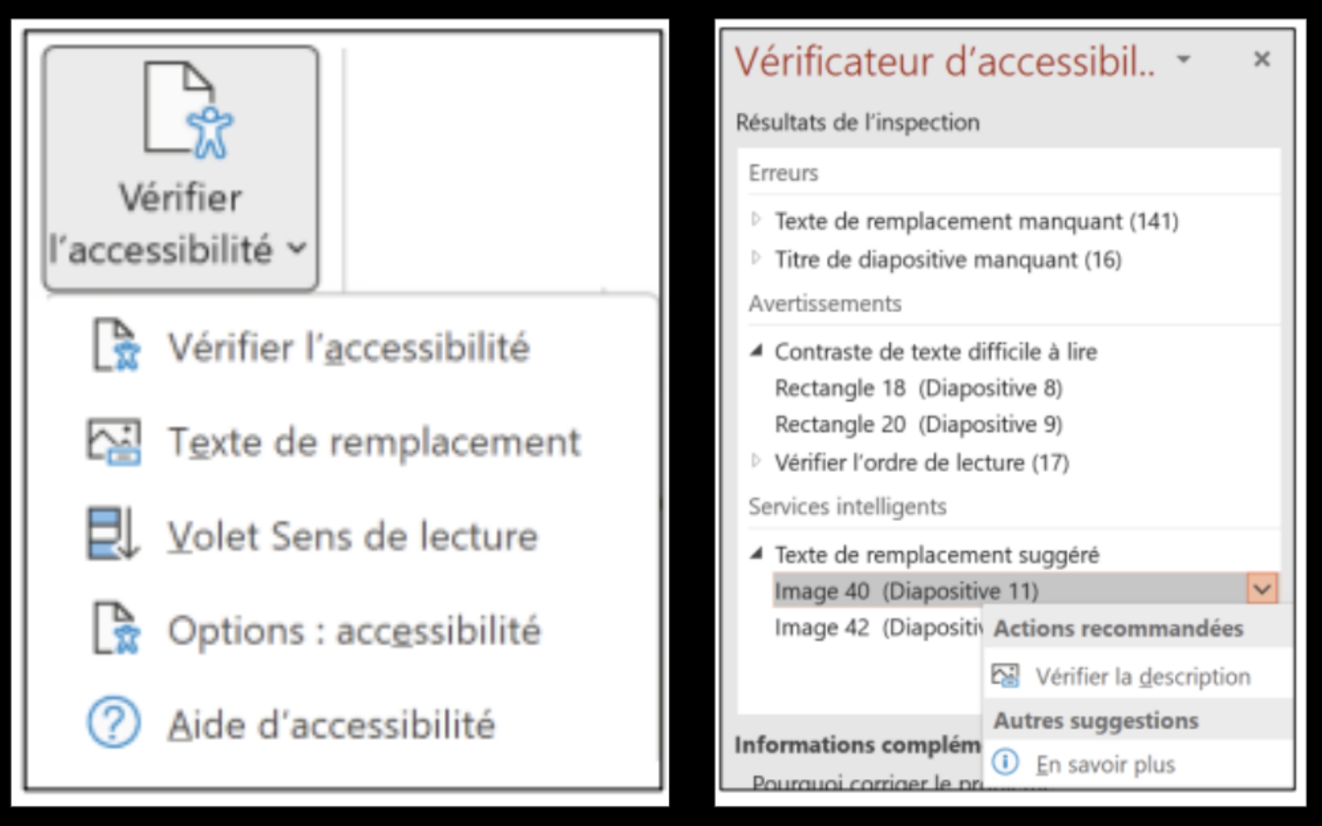 Vous souhaitez proposer des supports de communication accessibles conformes aux RGAA. Mais, vous ne savez pas par où commencer, ou comment vous y prendre. Tous les logiciels de la suite Microsoft ont un vérificateur d’accessibilité. En activant cet outil, vous obtenez un rapport des points bloquants qu’il vous faut améliorer :
