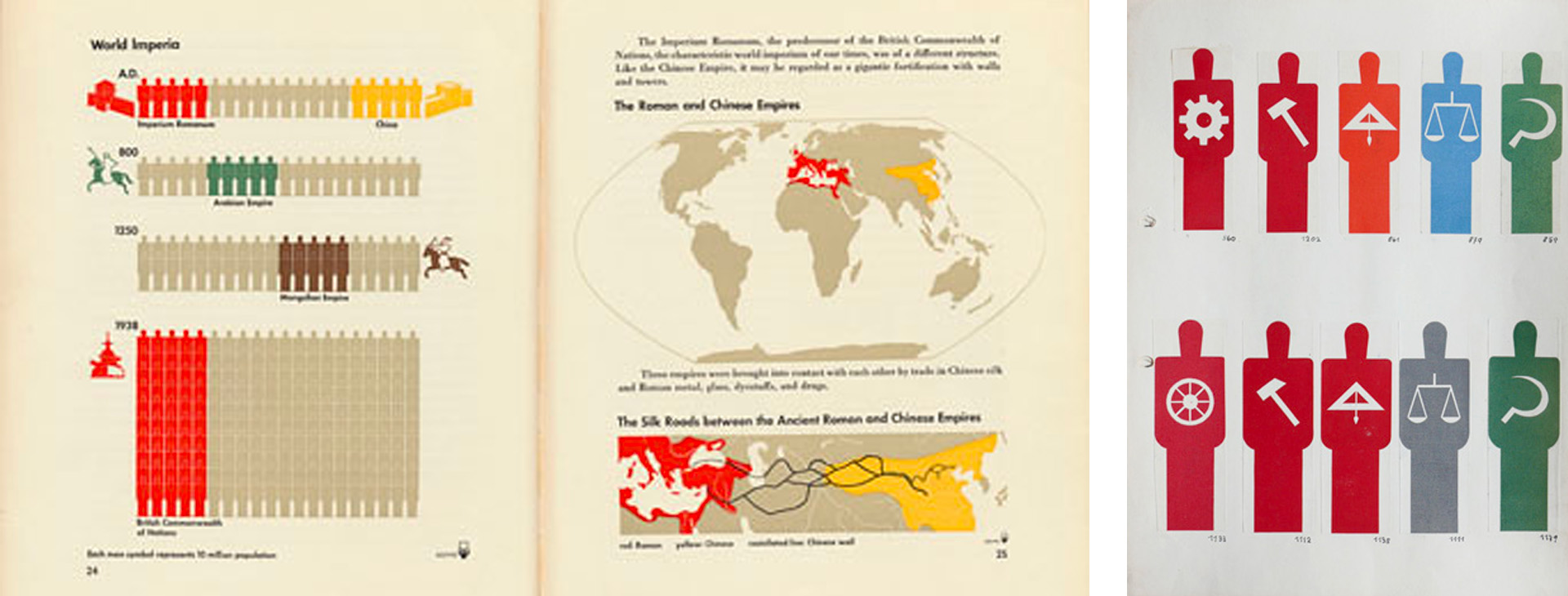 Dans son livre Modern Man in the Making, Neurath met en scène les données sociétales de l’époque. Il créée ainsi des centaines de schémas que l’on appelle infographies, si prisées aujourd’hui.